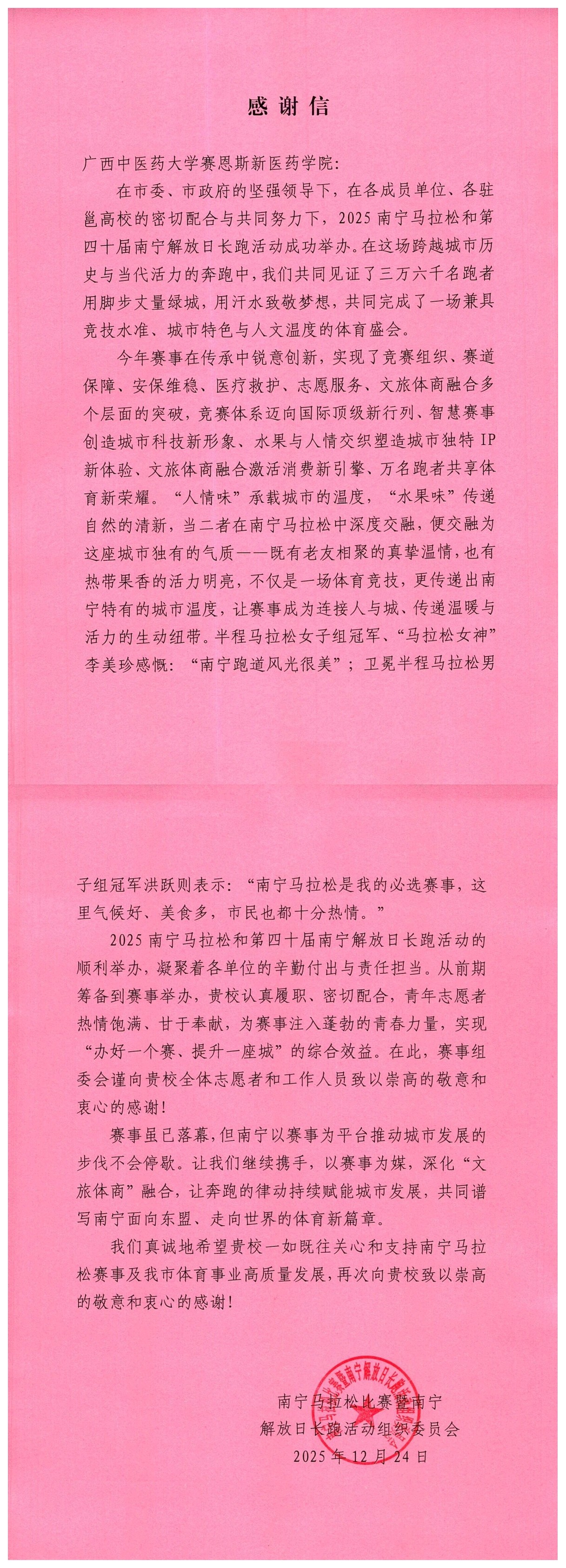 近日,学院收到南宁市马拉松组委会的一封感谢信,感谢学院选派730名志愿者参与南宁市马拉松赛事,信中对我院师生在2025南宁马拉松赛事中的出色表现给予高度肯定。