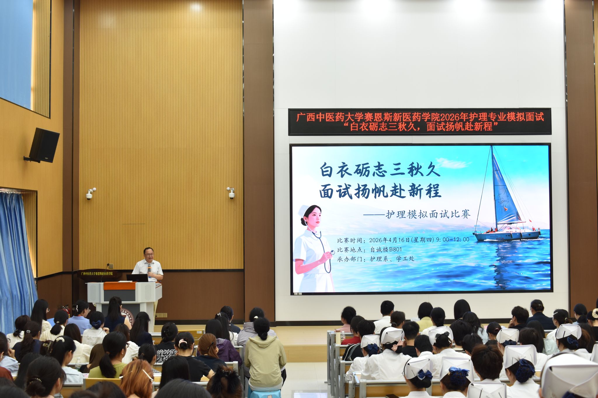 为帮助护理专业学子提前熟悉求职面试流程、锤炼面试实战能力、明晰职业发展方向,4月16日上午,我院护理系在自诚楼B801教室成功举办2026年护理专业学生“白衣砺志三秋久,面试扬帆赴新程”模拟面试活动。学院副院长杨仕权出席并致辞,护理系工作人员及309名护理学子共同参与,护理系主任岑洁霞主持。