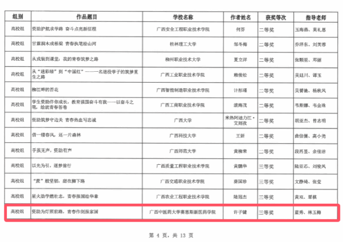 近日,从自治区教育厅公布的2025年全区“学生资助伴你成长,教育强国奋斗有我”资助主题征文比赛获奖名单中获悉,我院学子许子键的作品《资助为灯照前路,青春作剑报家国》荣获三等奖、李杭芝的作品《资助化甘霖,共筑药香梦,不坠青云志》荣获优秀奖,蓝秀、林玉梅、黄秋琳、袁小玲获优秀指导老师。