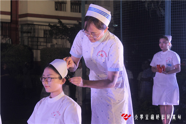 接下来的授帽仪式由我院党委领导、各医院护理部领导参与,为我院179名护理系同学进行神圣而庄严的授帽。这意味着他们将担负着前辈的寄托,在护理事业的道路上砥砺前行。随后,杜丽群老师依次点燃大家手中蜡烛,冉冉的烛光,象征着燃烧自己,照亮别人!象征着无私的奉献,象征着南丁格尔精神代代相传,永不湮灭!最后,杜丽群老师还为我院护理学会的《南丁格尔志愿服务队》授旗并带领大家宣誓。