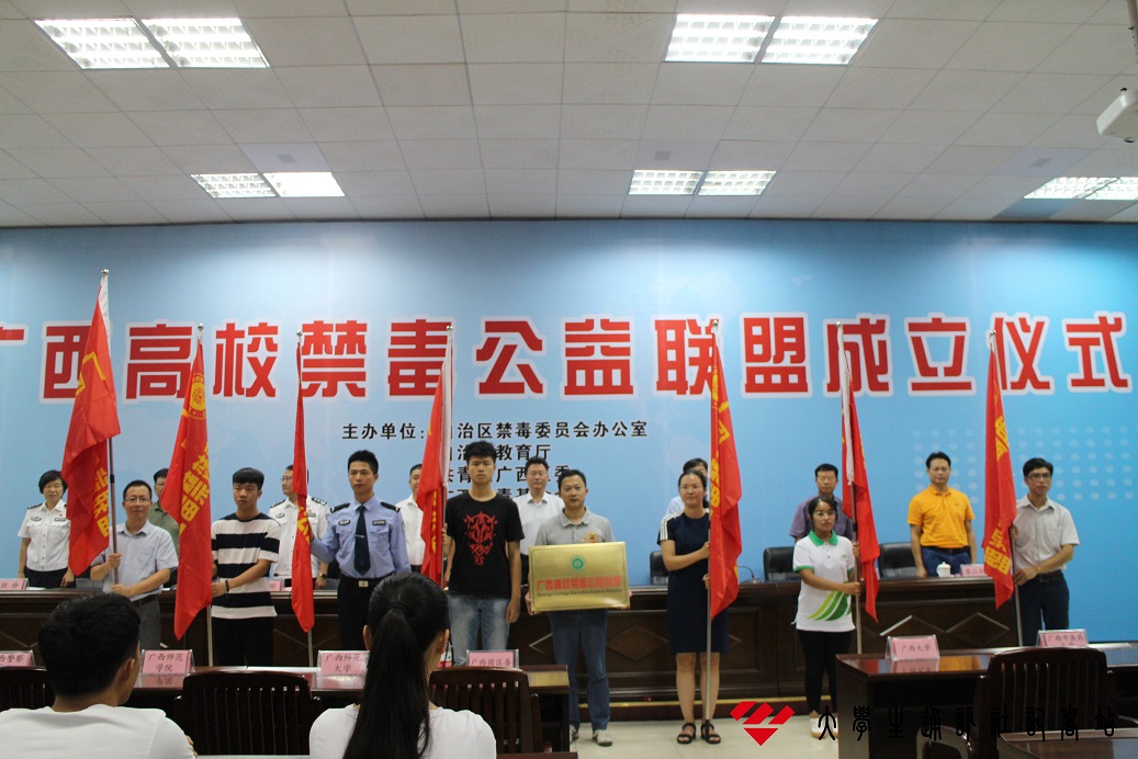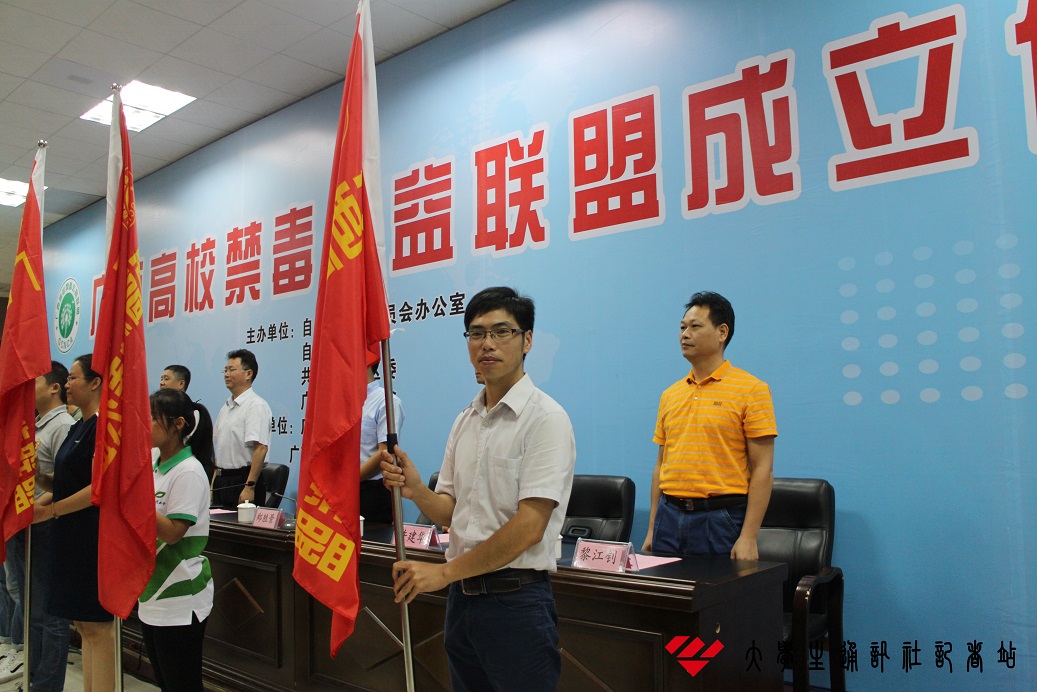 会议伊始,广西警察学院院长周彬致辞,提出了对开展高校毒品预防教育的高度重视,并呼吁各界对联盟发展给予关注。国家禁毒办副主任、中国禁毒基金会秘书长李宪辉指出,近年来,全国毒品形势十分严峻,要坚持铁腕治理,始终保持严打高压态势,并从源头抓起,深入禁毒宣传,守卫和谐校园。随后,学生代表宣誓。国家禁毒办副主任、中国禁毒基金会秘书长李宪辉宣布广西高校禁毒教育联盟成立。主席台就座领导向各高校代表授旗,我院谭入铚书记接过旗帜并与各高校代表一起庄严宣誓。