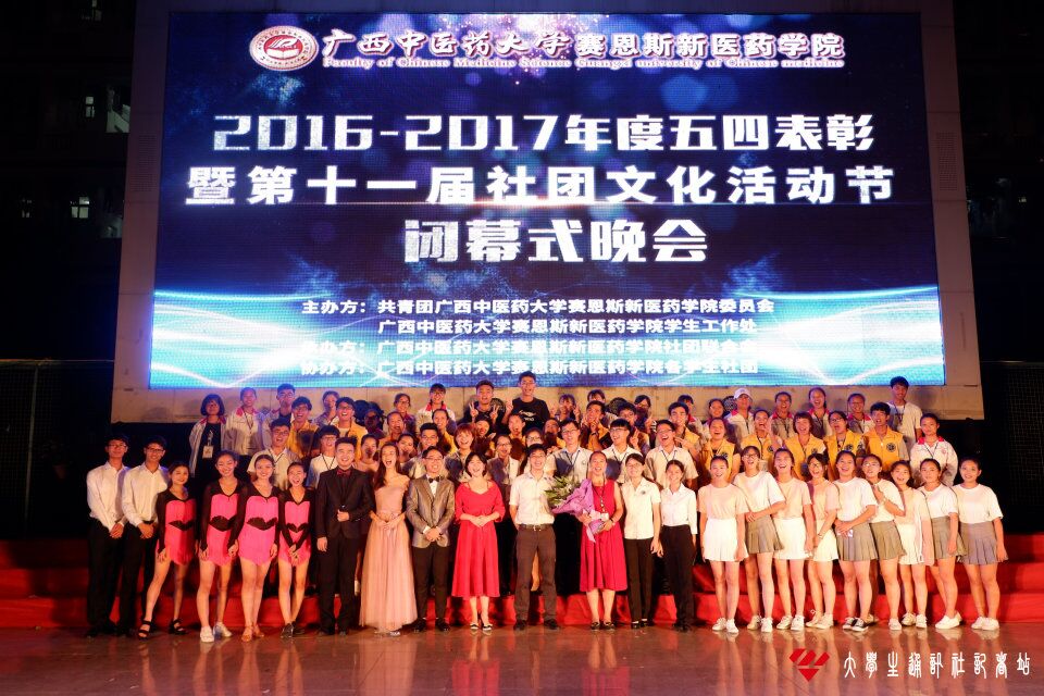为了加强我院学生社团组织建设,提升大学生的综合素质,并对我院优秀青年进行表彰,于6月11日晚在LED舞台开展了由我院学工及团委主办,社联承办、各社团协办的广西中医药大学赛恩斯新医药学院2016-2017年度五四表彰暨第十一届社团文化活动节闭幕式晚会。此次闭幕式晚会邀请到我院院长梁天坚,党委书记李成林,副院长冼锦华,纪委书记叶绘晟,学工处处长黄学政,团委书记谭入铚,学工处副处长吕映福、黎桂曹,出席本次晚会的还有众外校嘉宾、本校各大社团成员以及学生代表。