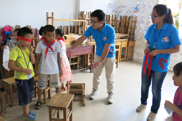 青年志愿者帮助小朋友们躲过重重障碍