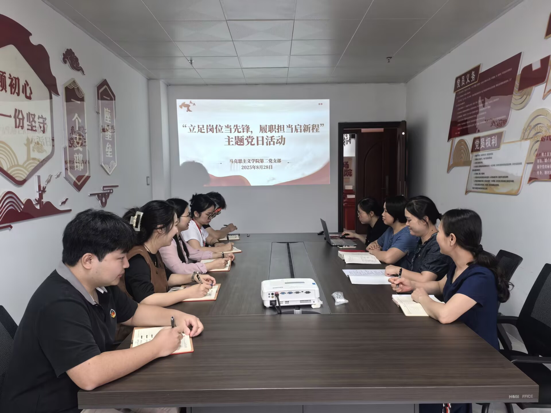 为深入学习贯彻习近平新时代中国特色社会主义思想和党的二十大精神,全面落实习近平总书记关于教育的重要论述,将政治理论学习与新学期开学筹备工作深度融合。8月28日,马克思主义学院第二党支部全体党员开展了“立足岗位当先锋,履职担当启新程”主题党日活动。