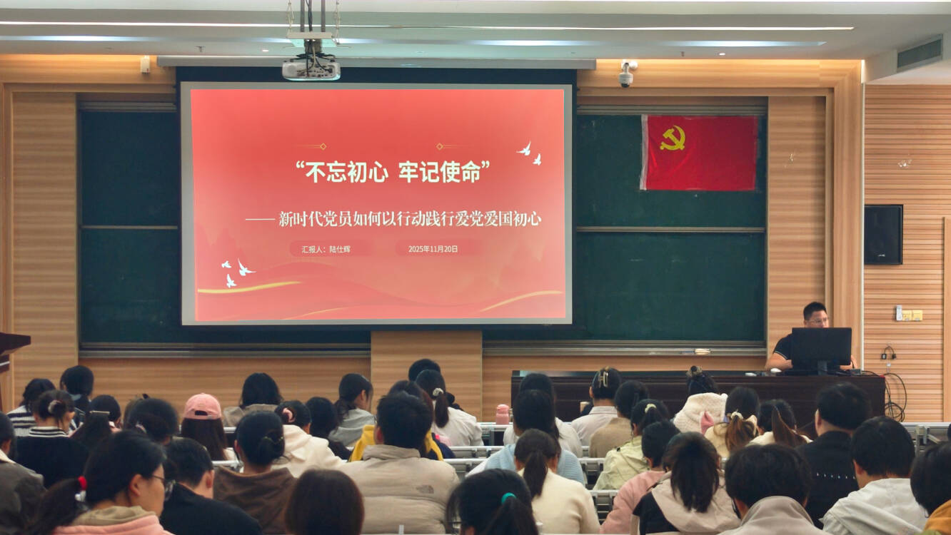 为筑牢思想根基、坚守精神旗帜,11月20日上午,学生第四党总支书记陆仕辉以“不忘初心,牢记使命——新时代党员如何以行动践行爱党爱国初心”为主题,为在场同志们讲了一堂生动深刻的专题党课,带领大家一起回顾党的光辉历史,感悟党的初心使命。在校党员、发展对象及入党积极分子参与学习,本次活动由党总支书记陆仕辉主讲。