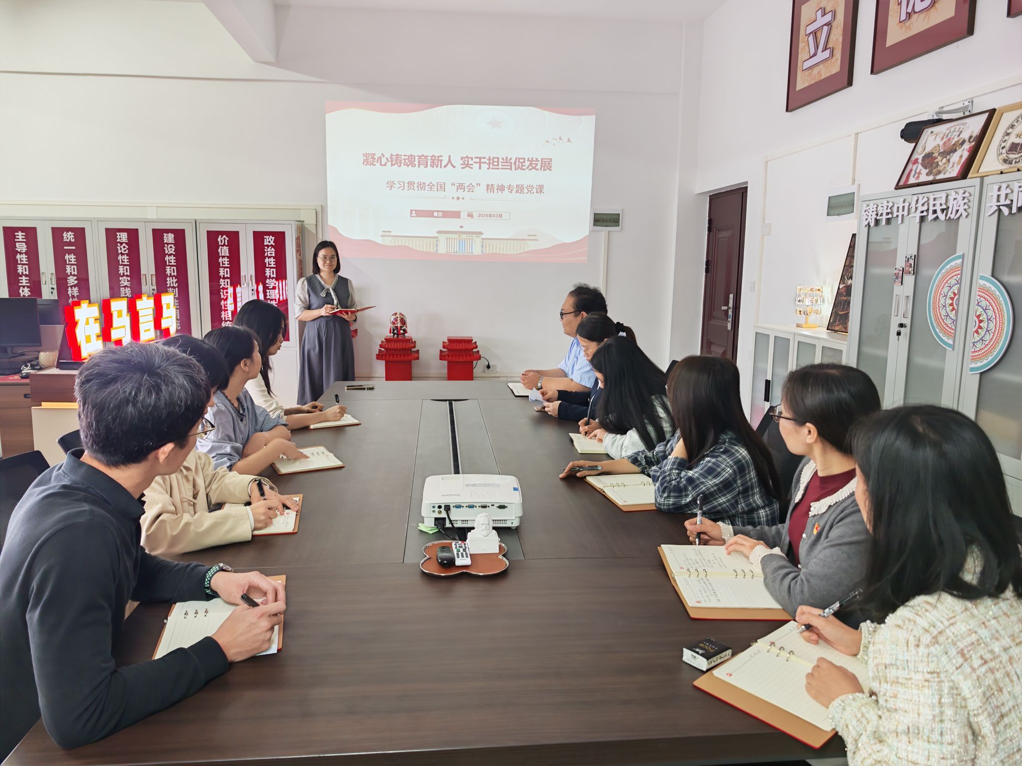 为深入学习贯彻2026年全国两会精神,帮助党员教师进一步掌握和了解国家有关政策,明确自身肩负的时代责任,3月16日,马克思主义学院第一党支部组织开展以“凝心铸魂育新人,实干担当促发展”为主题的学习贯彻全国两会精神专题党课,党课由党支部书记黄兰主讲,党支部全体党员参与活动。
