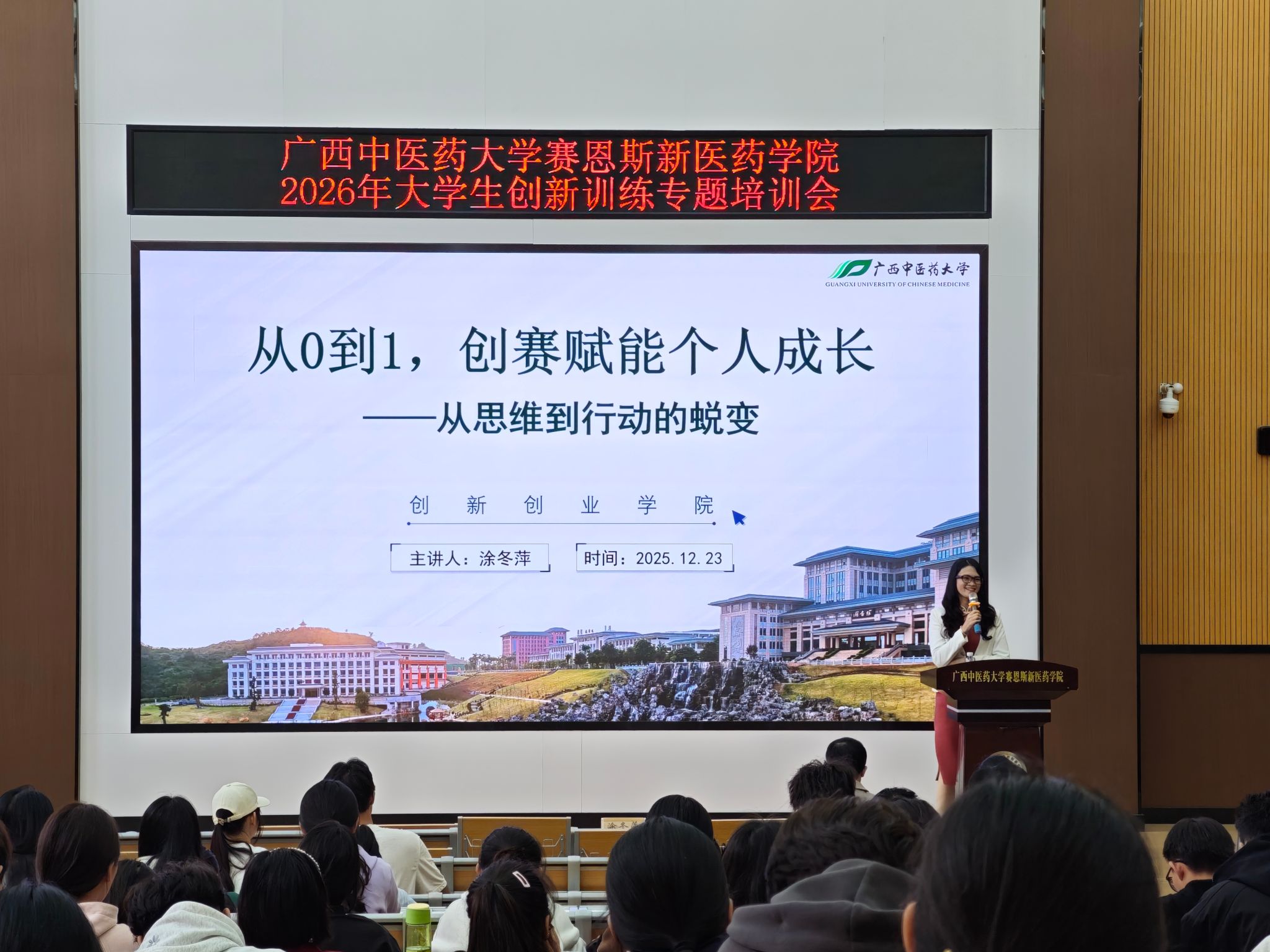 为深化大学生创新创业教育,12月23日,科技处在自诚楼B801教室举办大学生创新训练专题讲座,讲座邀请了广西中医药大学创新创业教育专家涂冬萍教授作题为《从零到一,创赛赋能个人成长——从思维到行动的蜕变》的经验分享。