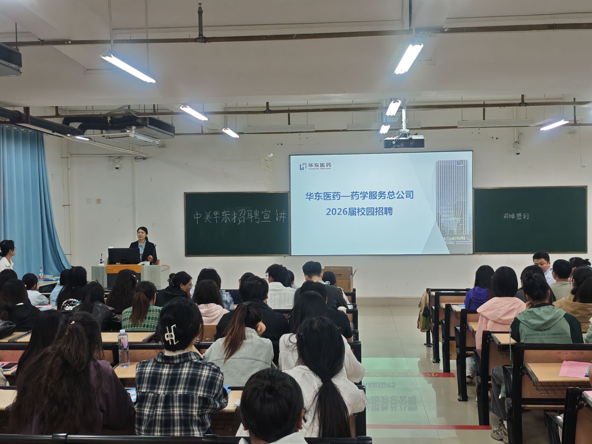 为进一步拓宽毕业生就业渠道,搭建优质校企合作平台,10月21日,杭州中美华东制药有限公司在赛阶301开展专场招聘宣讲会,2026届毕业生及部分实习生参加。宣讲会上,企业负责人以宣传片展播与PPT 讲解相结合的形式,详细介绍了公司发展历程、主营业务及福利待遇等情况,并聚焦行业发展趋势、个人职业规划、岗位匹配度等要点,重点介绍了针对应届毕业生的人才培养计划与岗位需求,如药学服务专员、临床推广专员、院外推广专员以及人...