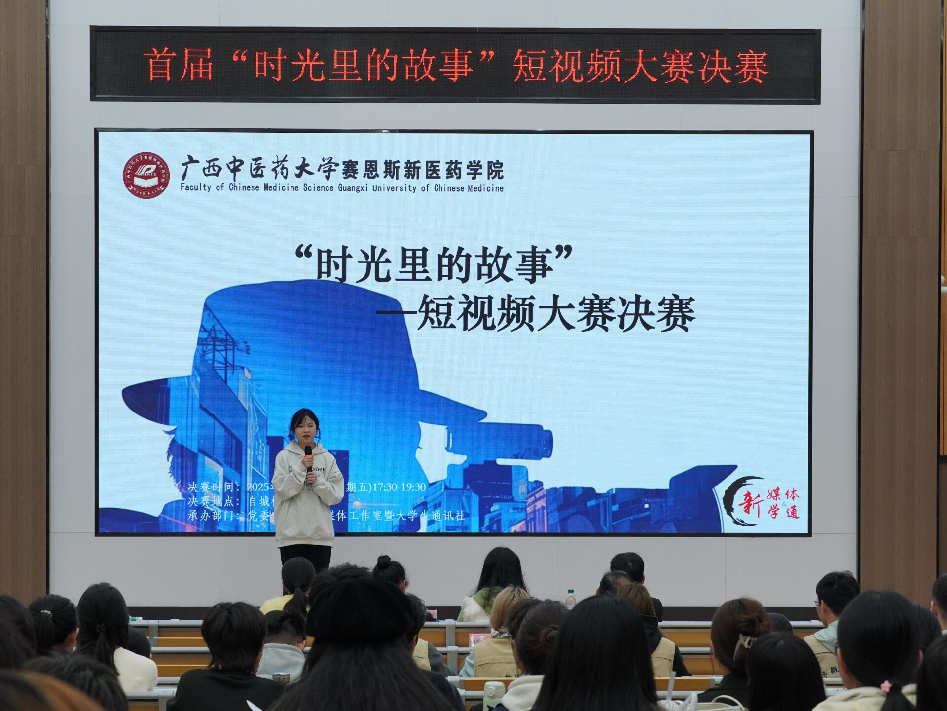 12月5日,经过一个多月的火热征集与激烈角逐,我院首届“时光里的故事”短视频大赛决赛在自诚楼B601圆满落下帷幕。本次大赛由党委宣传部、新媒体暨学通承办,通过线上互动与线下展示相结合,生动展现了我院学子敏锐的观察力、丰富的创造力与出色的新媒体实践能力。大赛自启动以来,受到全院各年级学生的广泛关注与积极响应。在网络初赛阶段,承办方共收到40余部投稿作品。同学们以独特的视角、细腻的笔触和创新的视听语言,围绕...