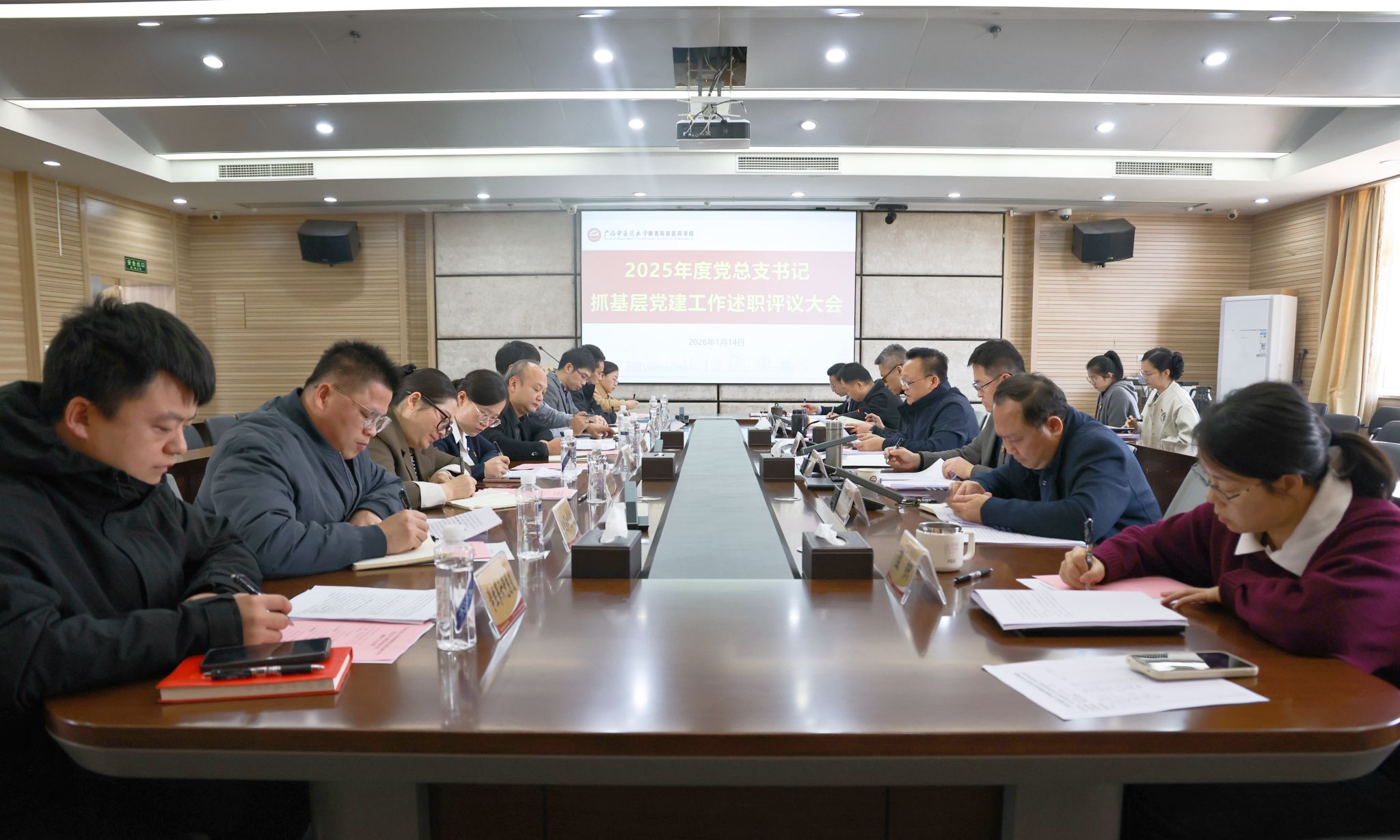 1月14日上午,我院在教学实验楼八楼第二会议室召开2025年度党总支书记抓基层党建工作述职评议会。学院党委书记肖华业,党委副书记、院长祁文,党委副书记宋南,副院长杨仕权、伍金荣出席会议,全体党总支书记以及相关职能部门负责人参加会议。会上,9位党总支书记围绕履职情况、存在问题及原因分析、下一步工作思路等依次进行述职,述职紧扣实际,在讲工作成效的同时,重点对存在问题进行了梳理和剖析,达到了总结成绩、查找问...