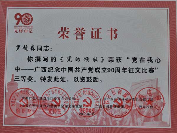 根据《转发关于“党在我心中——广西纪念中国共产党成立90周年征文比赛”活动获奖情况的通报》(桂党高工宣〔2011〕66号)文件精神,我院罗镜森同学和梁梓扬同学分别荣获比赛三等奖及优秀奖。在我院的选送的征文作品...